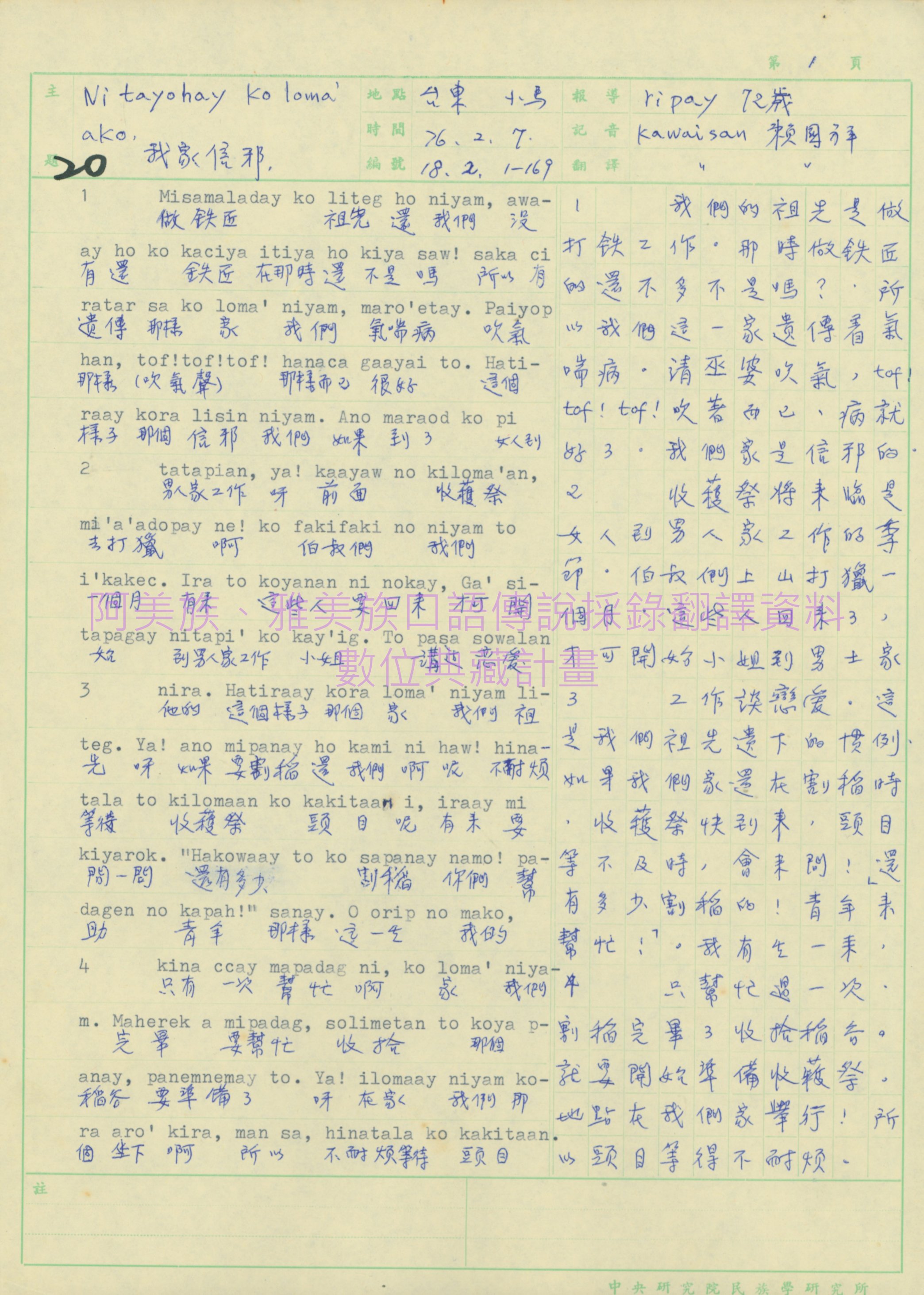 (01)我們的祖先是做打鐵工作,那時做鐵匠的還不多不是嗎?所以我們這一家遺傳著氣喘病,請巫婆吹氣,tof!tof!tof!吹著而已,病就好了,我們家是信邪的。 (02)收穫祭將來臨是女人到男人家工作的季節,伯叔們上山打獵一個月,這些人回來了,才可開始小姐到男士家工作談戀愛。 (03)這是我們祖先遺下來的慣例,如果我們家還在割稻時,收穫祭快到來,頭目等不及時,會來問,「還有多少割稻的!青年來幫忙!」我有生以來,只幫忙過一次。 (04)割稻完畢了收拾稻穀,就要開始準備收穫祭,地點在我們家舉行,所以頭目等得不耐煩。 (05)這樣子,唸咒的人來了,不知道怎樣,我也不瞭解究竟,我一生只見到這麼一次而已,我們家本來就有tayoyohay的事情,這個和唸咒語的不一樣。 (06)唸咒時有klig!klig!的鈴聲,信邪的是先製造放肉的木器,像個放豬飼料器物那麼大,還要裝上一個女人陰部。 (07)一個是男人陽具,還要附著陰毛,我們伯父叔父所穿的衣服,用飾物編製,像是刺繡,穿著這種衣服,來坐在放肉木器上,讓村裡的青年拉著。 (08)到傳令組,「拉吧!拉吧!我,是貓是貓也有聲!是猴子也偷看!」青年們唱,我這麼一次趕上盛況,太太們。 (09)我的伯叔父們的太太們,搶著在道路的拐彎處等待,讓拉著伯叔們的青年喝水。事情就是這樣,我們家信邪相當厲害,所以我們這一家族人,稱呼toklicay。 (10)什麼是toklic,是指拉的繩子,toklic原來是蔓草的一種,作為拉木器的繩子。如果運氣好,不會斷掉,如果運氣不好,會斷掉。 (11)我們家的伯叔父很多人乘坐,也可以拖拉啊!傳令組在後面,面向後面,向前拉,前頭者向前拉,後面者向背拉。是啊! (12)要做成陰部和陰毛、陽具,不是真人,是做出來的。木器這麼大,要做大一點,要造陽具和陰部啊! (13)之後,我們的伯叔父們坐上去,伯叔父們穿著用飾物刺繡的衣服。別的呢!如果到祭拜的日子,在家北邊放著一隻豬,一直唸咒著。 (14)那條豬慢慢變成紅潤的顏色,我只有這麼一次看見,我趕上這麼奇怪的信邪,以後變換了祭神,變成日本時代了。 (15)之後殺了那一條豬,只有伯叔父們在本家來吃,沒有給別人孩子們吃,只是伯叔父們,在屋內吃光了,要找一隻不大不小的剛好的,不要殺大隻的。 (16)一次就要吃光啊!我們家信邪,就是這樣啊!我根本不知道什麼金錢的,也沒有看到金錢出來的。 (17)如果我們生病了,要請巫婆來治病啊!用口吸生病原來像是飾物不是嗎?不是硬幣,南部的是飾物,北部的是硬幣和檳榔。要唸咒啊!有個叫sontok祭祀者。 (18)那時候這裡的,現在還建在,在都歷住著,祀母是叫tinsayan。好像我這麼大的歲數,他是問卜唸咒的工作。 (19)拿了許可證了,警察不會取締,登記有案,所以大家都大大方方去問卜唸咒,像我的錢不見了,我馬上到他那去問卜,「如果時間耽擱了,不會馬上找到啊,母親!」 (20)真的,「啊!很快!母親!」是真的,三萬元丟掉時,我去問,「這個不會很快唷!但找回來!」hilosi當選時。 (21)做為當選費用的五萬元,是hirosi的預算,是第一次當選縣議員,結果不見了三萬元,只有用到兩萬元,所以桌子不夠不是嗎?那時當選慶祝我們不是嘛! (22)那時拿手提包,nopmko和maciyag在衣櫥裡,結果出來了紙幣了,「啊!amoy是真正的富翁!怎麼散放這麼多紙幣!」 (23)amoy聽到了,跳起來去了!一算結果,就是丟掉的錢回來了三萬元,sontok這個人很會牽住人的心裡,最先是三千七百元,我去了,「哇!是有!常問親戚啊!」 (24)我就問一問親戚,每天早晨按序問,每天早晨這樣,結果回來了,我有三次的經驗。 (25)我的錢。只有那個八千元而已,我沒有去問卜了。孩子們有話說,「母親!錢丟掉沒關係!這樣才不會生病啊!」到現在我從未生病啊!就是這樣。 (26)他跟我相同歲數,他七十三、七十四,我今年才七十二歲,對於取出別人放置的東西。我試過一次,是啊! (27)又是那一句話,「看見那條煙絲從那裡升出來,對準那裡,就有放置的東西在!」tinsay這麼說,我看見了煙火,但見不到煙從那裡升起啊!煙像是呼出小小煙斗啊! (28)那一絲煙。「煙從那裡升起的,對準那裡,取出東西來!」我從未見煙從那裡升起,maagagay拿著香蕉葉扇。 (29)我如果完成學習,對於那種的事,有詳細的說明給你們,那時老人家說過,我母親是個祭祀師,配合起來,「是我自己的孩子!」母親說,「別的祭祀師才好!」 (30)母親說。所以我沒有完成,曾有學習過,我參加過他們祭祀舞,只這麼一次,我母親不會演說啊! (31)從前時候,別人如果去了我們的打鐵處,會被感染邪魔,原來我們的祖先是從綠島遷移到臺灣來,不知道是在哪一座橋樑,這麼說啊!是在什麼的南邊說。 (32)ifodafodak那裡啊!那座橋樑還在,有一個祖先,伯父留下來,變成石頭的,現在還在綠島那裡,這麼說。 | |||